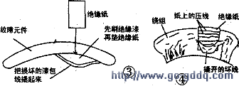 如果电机通电后不运转。有时还伴有轻微的“嗡嗡”声,测量主、副绕组之和不等于总,即可判断为主副绕组之间短路。拆开电机,焊开主副绕组公共端的连接点,用摇表检查主副绕组的绝缘,如为0,则证实为主副绕组短路,检查方法如图1所示。这时可正反两面仔细检查主副绕组互相接触的地方,如发现有烧黑的痕迹,就是短路的地方。把副绕组故障元件的捆扎线全部剪断,剪捆扎线时注意勿损伤绕组线圈。再把电机置于烘箱中到80℃以上,取出电机后趁热把副绕组故障元件尽量往里推压,使短路的主副绕组两个元件分开,这时短路部位即全部暴露出来,如图2所示。短路时损坏的漆包线只是表层的线,一般只损坏几根,严重时可损坏数十根,用有刃口的薄塑料片把损坏的表层漆包线全部小心的撬起来,然后在撬线的地方涂一层绝缘漆,再垫一层面积适当的薄绝缘纸(如图3所示),再把被撬起来的漆包线压贴到绝缘纸上,每隔一根线压一根线,压贴到绝缘纸上的漆包线相互之间也要有一定的间隔,当纸上的线排满之后再涂一层绝缘漆并垫一层薄纸,又把一部分线再压到绝缘纸上(如图4),如此反复操作,直到把所有损坏的线处理完为止,最后再涂一层绝缘漆,垫一层绝缘纸(注:凡粘连在一起的线一定要分开,以防局部短路)。主副绕组凡损坏的线都应按此处理。待绝缘漆稍干,线粘贴在纸上不会滑动时,再把扳动过的元件扳正还原,在元件间重新垫好绝缘纸。连接好公共端。重新捆扎、烘干即可装机使用。