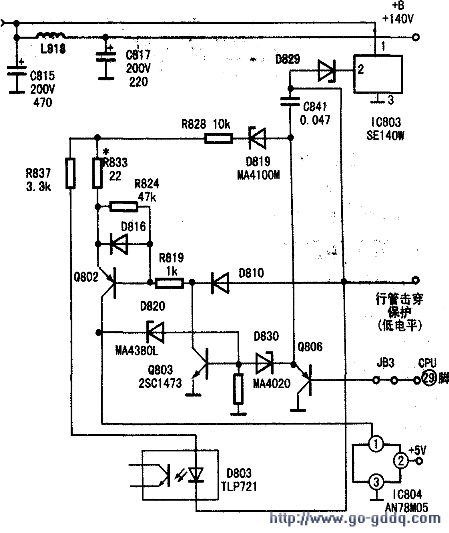 这样的改动还考虑了与之相关的保护电路:如果行管出现击穿故障。仍然可以拉低光耦D803内部负极的电平。使开关电源进入保护状态,所以原有的保护功能未受影响。