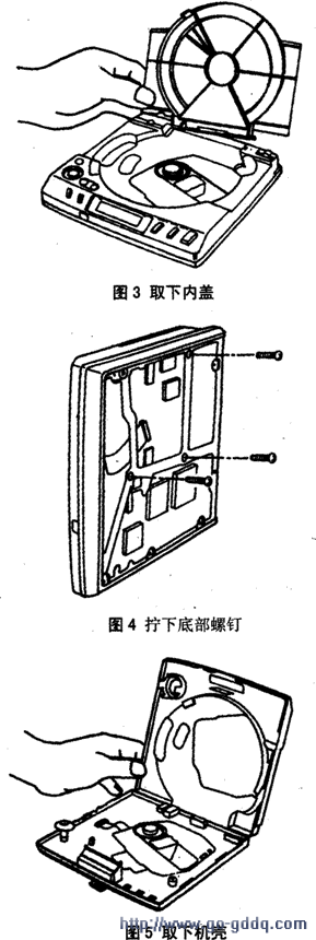 4.分解壳体参见图4,拧下底部的3颗螺钉,取下机壳。分解时注意框架与机构总成仅由1颗螺钉固定(参见图5所示)。注意取下机壳时勿丢失开关按钮。