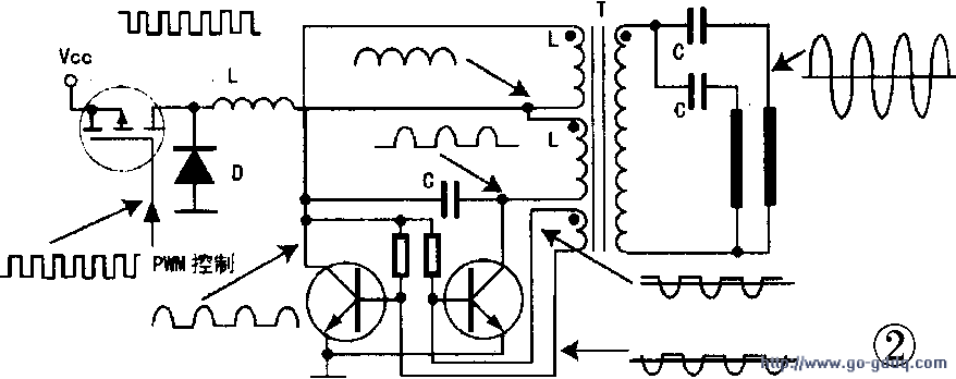 如果在保护电路未动作之前测得无放电火花产生,则应测量各级供电电压是否正常,高压开启(Light—OFF或者PWR-0N)是否正确;用示波器测量末级管或者激励集成块信号输出引脚是否有50k以上波形(具体频率因机型而异,通常幅值在10V~20V)是很直观的检查方法。如果有波形,对于上期介绍的Rover(自激)结构逆变电路故障在灯管,对于推挽结构等逆变电路故障在高压变压器或灯管。当然以上都不可忽略对次级高压输出的检查。图2是Royer架构INVERTER各点波形。