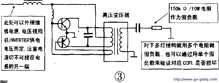如果确认故障在INVERTER上,不连接灯管检修会因为保护电路启动而影响判断,连接灯管检修又因为灯管脆弱、长度太长而比较麻烦。此时就可以应用“假负载法”进行检修。其方法如图3所示。