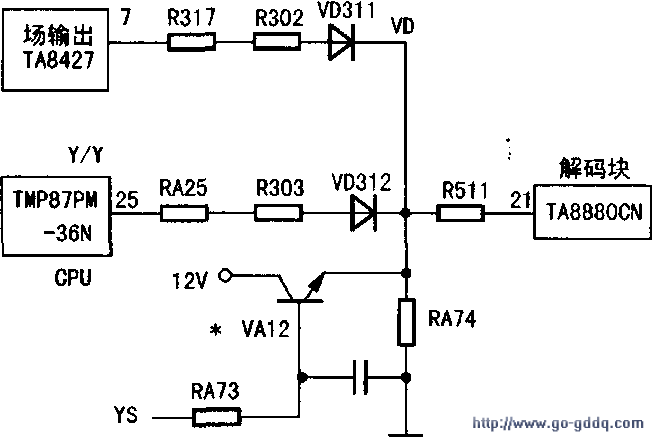 9.画中画彩电,小画面选通电平异常(呈高电平)时,也会引起黑屏。在图中所示电路中,TA8880CN 21脚为集成块内部的TV/TEXT开关控制脚。屏幕上需要显示字符时,25脚输出的Y/Y控制脉冲信号通过RA25、R303、VD312加到TA8880CN21脚,控制集成块内部的TV/TEXT开关切换电路将R、G、B字符脉冲与内部信号通道接通。需要显示子画面时,子画面的选通脉冲YS通过VA12射随器送到TA8880CN 21脚,接通集成块内部的子画面信息传输通道。TA8427⑦脚输出的场逆程脉冲,通过R317、R302、vD311、R511加到TA8880CN 21脚作为场消隐信号。
