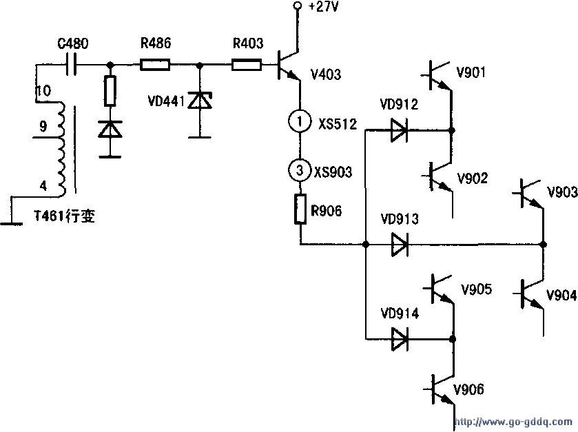 行扫描逆程期间,T461⑩脚输出的行逆程脉冲经C480、R486、R403隔直降压,VD441限幅,输入至V403的基极,从V403射极输出逆程正脉冲,通过VD912、VD913、VD914注入射一基视放电路的中点,促使V901、V903、V905射极电位在行扫描逆程期间升高而截止,即电子束在行逆程期间完全截止而消隐。当V403 c—e结击穿漏电时,此电位同样会使V901、V903、V905截止,而出现黑屏故障。检修该机黑屏故障时,可测V403 e极电压(正常收看时为低电压),或取下R906判断。然后逐一检查相关元件,即可排除故障。