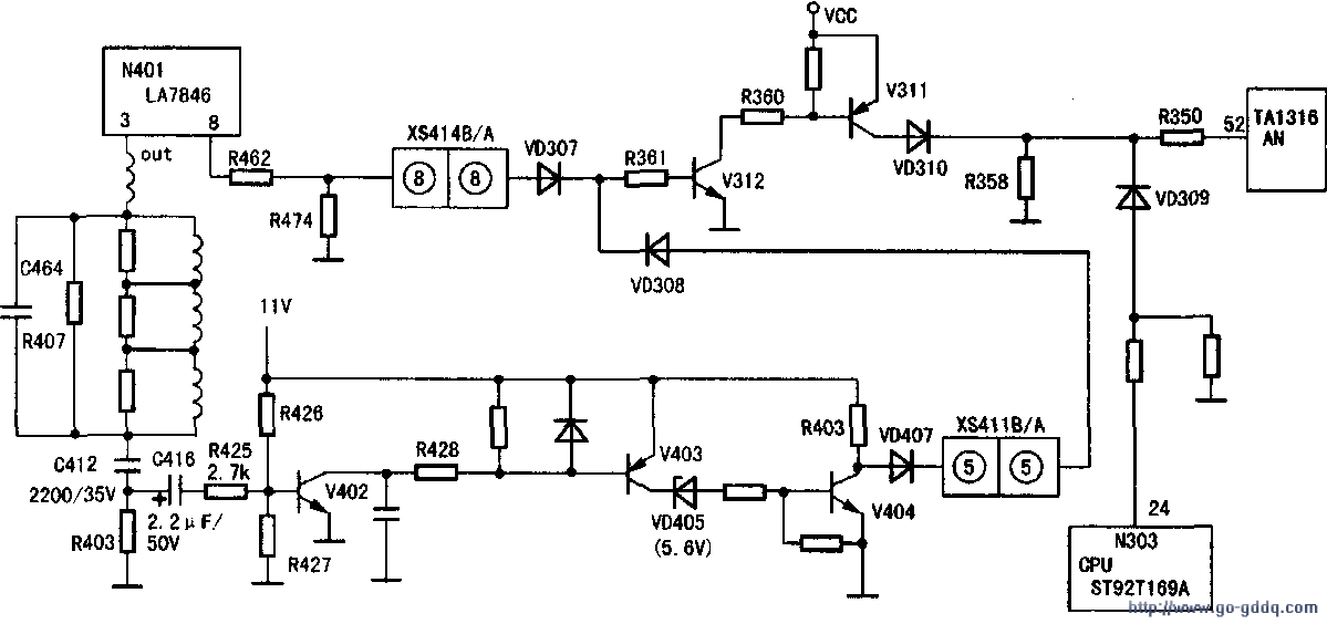 11.场保护性消隐黑屏。左图为康佳60P机芯背投彩电场保护性消隐电路。当60P机芯背投彩电场出现故障时(或中工厂软件数据变化、Vramp垂直斜率、Vramp斜波线性任一项不为O时,加到场的激励信号异常),由C416、R425引入的场扫描反馈则为0V,V402处于截止状态,V403截止、VD405、V404截止,VD407导通、VD308导通、V312导通、V311导通,V311的c极为高电平,通过vD310加至TAl316AN 52脚,内部消隐开关启动,关闭R、G、B输出。另外,N401⑧脚输出的场逆程脉冲出现异常高电平时,通过R462、R474分压,使VD307导通,同样将高电平送到TAl316AN 52脚,使图像信号消隐。