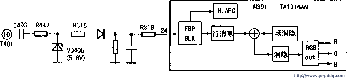 在右图所示电路中,若VD405击穿或其他原因导致24脚没有正常的行逆程脉冲输入时,行消隐电路动作,就会使R、G、B输出端终止输出而出现黑屏故障。