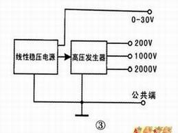 自己制作一些测试附件是必要的,这对于维修人员来说并不困难,花费也不大。测试这些元件主要是制作一台能够产生几伏乃至数干伏的电源,输出电压要求稳定,使用时可以任意调节。整个电源可以由一台低压直流稳压器和高压发生器组成,如图3所示。
