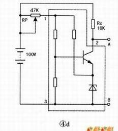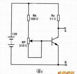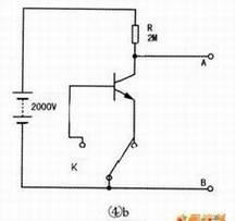 图4a是测量光电耦合器的电路,调节RPl,测量AB两点间的电压,其电压变化大小表明了器件的好坏与质量,检修原理读者可以自己分析;图4b用来测试,测试电压应根据具体元件选定,R用于限流,取值应根据测试元件不同而改变,要求短路AB两点之后,所通过的电流在1mA~5mA之内,如果测量,这个电流可以在5mA~10mA之内选取。图中元件数据是用来测试行管或开关管的,为了获得较小的误差,万用表的内阻要大于限流电阻的十倍;图4c用于测量三极管的饱和压降,对于要求输出较大功率或大电流的三极管,这个参数很重要。测试原理就是在一定的集电极电流时,改变基极电流直到三极管饱和,即集电极电压不再下降,此时的集电极压降可以认为是该集电极电流状态下的饱和压降。测试电路中连接的电阻应根据具体要求选定,图中是按集电极电流1A左右设计的,基极电流从18mA~110mA,可适应直流放大倍数在10~55倍之间的大功率三极管;开关电源中使用的诸如SEll5之类的误差比较电路,可用图4d提供的电路准确测量,改变电路中的可调电位器,AB两点的电压应发生变化,否则此损坏。