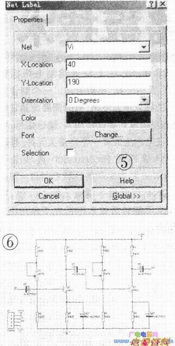 在“两级放大电路.Sch”设计窗口下,单击菜单Place/NetLabel(放置网络标号),箭头带出一个虚线框(见图4电路输出端),将其放入两级放大电路的输出、输入端及连接头CON4的2、3两个端点如图4所示。双击电路中输入端网络标记文字,将弹出NetLabel对话框如图5所示,在Net栏中输入Ui,单击下方“ok”,放置电路输入端网络标记为Ui;用同样的方法放置连接头CON4的2端网络标记为Ui;用同样的方法放置电路输出端和连接头CON4的3端网络标记为Uo。再将+12V标记放置到连接头CON4的1端;将接地标记放置到连接头CON4的4端,完成后的两级放大电路如图6所示。