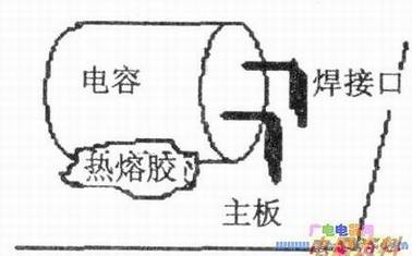 热熔胶主要用来加固元件和电容。元件检查好后,在元件与主板间加热熔胶;卧放的电容可在其两侧加热熔胶,目的是使元件或电容与主板成为一体(见下图),避免电脑运行时元件产生振动。