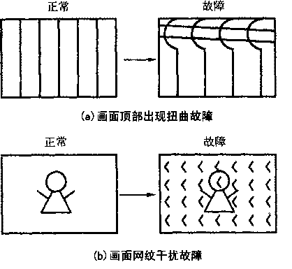 (4)在收看电视时偶尔出现拉白条、拉黑道或画面顶部扭曲等现象。这在电视台转插差转接收信号时时有发生,故障现象如图下(a)所示。