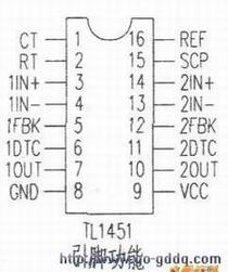 (4)TL1451AC的检测:该芯片的引脚功能如右图。(9)脚的供电由2只贴片式三极管Q201、202控制。接到CPU的开机信号时(9)脚通电,(10)脚输出高电平,启动场效应管控制电路的2只三极管,场效应管给逆变电路提供电源。芯片的(14)脚对灯管电流取样。(3)、(16)脚合并通过接到功率管的供电电路上。(15)脚是保护控制,该脚接地,则解除保护。如果出现开机正常,之后黑屏的故障,怀疑保护电路动作时,将(15)脚接地,就可解除保护功能,让显示器处在无保护状态下工作。若(15)脚接地后不出现黑屏故障,说明逆变电路有过压或不平衡故障。