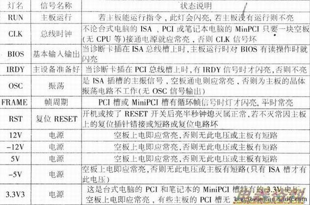 当插在ISA总线槽上时,电源指示灯组为12V、-12V、-5v、5v;信号指示灯组为BIOS、Osc、CLK、RST、RUN。各种指示灯的亮灭代表的信息如下表所示。