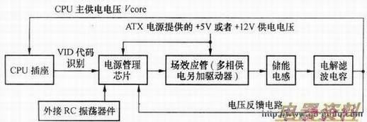 CPU供电是为CPU提供电能,保证CPU在高频、大工作状态下稳定地运行,满足正常工作的需要。CPU供电电路通常采用(PtilseWidthMedulation脉冲带宽),该部分电路主要是由PWM管理芯片、场效应管(MOSFET管)、储能线圈和'等元器件完成。CPU供电电路的电路框图如下图所示。