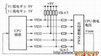 主板上所用的PWM管理芯片都有几个电压识别控制踹(通常为VIDO-VID4),这些引脚通常与CPU相连(如不接CPU,则这几个控制端默认为高),通过控制这些引脚的电平,就可以控制输出的直流电压值,即CPU的供电电压。