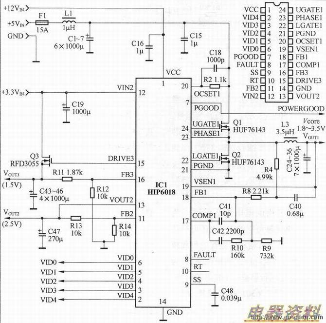 上图中两个MOSFET管Q1、Q2为开关管,IC1为PWM电源管理芯片HIP6018控制芯片,L1滤波,L3储能,C24-C36是CPU供电电压滤波。IC1的2-6脚为CPU控制电压识别信号输入端,其电平组合与输出电压的关系如下表所示。