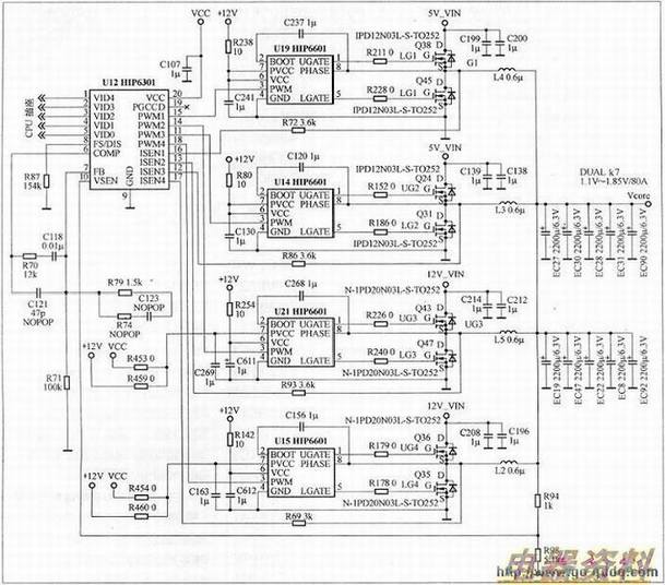 目前常用的四相供电电路芯片是ISL6556、HIP6301和L6714(L6714主要应用在支持双核CPU的新型主板中),ISL6556通常和HIP6602或者HIP6601搭配使用,完成对四相供电开关管的驱动。