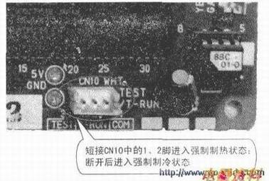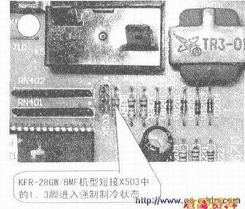 强制开机功能是变频空调器检修时的一种重要功能。在变频空调器中,使用强制功能可以进行自检过程,显示故障代码,维修人员可以根据空调器的故障代码进行高效、快速的修理。变频空调的室内、外机都有单独强制工作或试运转端子,利用这些端子让内、外机单独运转,这样就可以来快速判断是哪块板的问题,可以更有针对性的修复。KFR-28GW/BMF型空调器的强制运行方式,如上图所示。KFR-40GW/BM、KFR-36GW/BMF型空调器的强制运行方式如下图所示。