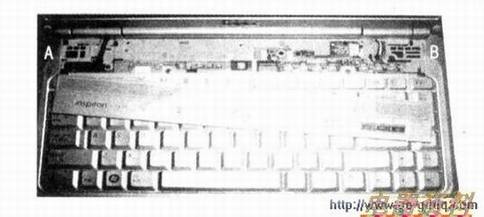 第六步:在下图中的A、B两点用平口改锥撬下开/关机按键及指示灯面板。