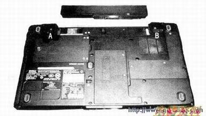 第一步:按下电池左右两侧(如图中A、B处)卡锁取下电池。
