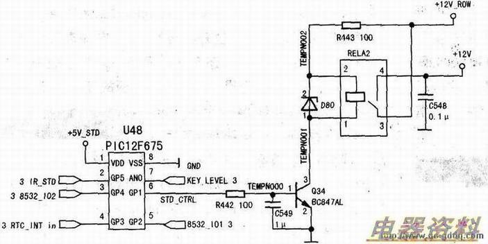 U48接收到开机信号后,其⑥脚输出高电位开机信号,经J2的④脚加至电源板的CON3的⑦脚。电源板正常工作,输出12V、24V电压,同时U48的⑥脚高电位还加至Q34的b极(见下图).继电器RELA2工作。12V加至主板其他电路供整机工作。我们可以在J2的STD脚测量主板是否向电源板输出了开机信号,此款为高电位开机,电平在3.5V~5V左右,可以配合观察指示灯的变化来判断。如输出了正常的开机信号,电源板应输出12V、24V电压,否则为电源板坏。如不能输出开机信号,可以判断为主板故障。需要注意的是:不同的厂家,由于电源板的不同,开机信号有可能为高电平,有可能为低电平,也可能不需开机信号。如果设置了开机控制信号的功能,无能是哪种状态,其在待机和开机时肯定有高低电压的变化,即低电平变为高电平,或高电平变为低电平。