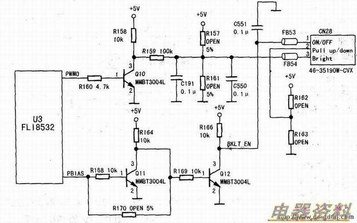 见下图,主板工作后,主芯片U3(FL18532)输出PBIAS高电位信号,经Qll、Q12后,再输出高电位经插座CN28①脚加至背光板。目前所有屏都使用高启动背光板工作,电压在2.5V~4V左右。如果此脚为低电平,背光灯不能正常工作。