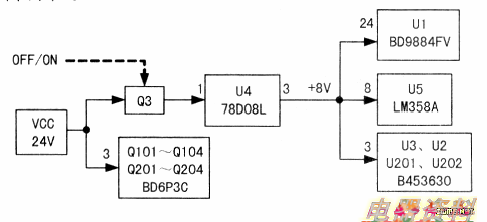 逆变器要正常工作,首先各、三极管等工作电压要正常。如三星LTA320WT-Ll6屏中的逆变器。在该逆变器中,来白电源板的+24V电压送入逆变器(VIT75001.50(后分两路(见图):一路直接为Q101-Q104、Q201~Q2O4供电:另一路经U4(78DO8L)稳压后形成+8V电压,该电压受CPU的开/关信号控制,当CPU输出高时Q3导通,+24V电压送入U4,经U4稳压后输出+8V电压送往U5、Ul~U2、U201~U2O2。维修时,可先测量各、三极管的工作电压,根据电压可很快找到故障部位。