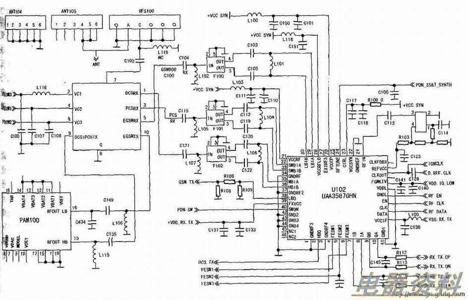 若连接金属导线到L108处,手机仍不能进入服务状态,检查相应的、、等是否损坏。若元件正常,检查更换功放模块PAM100天线开关Ul00或检查U200(CPU)电路等。