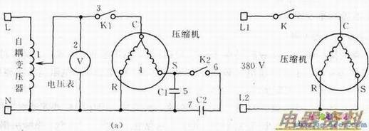 图中,1-自耦、2-表、3-开关Kl、4-压缩机电机、5-电容Cl(23μF~30μF)、6-开关K2、7-电容C2(50μF)。