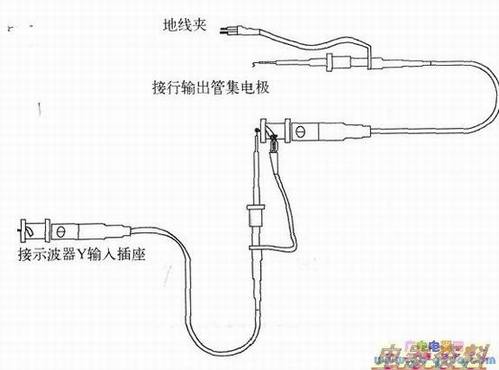 对双踪示波器,一般都配有两个10:1衰减探头,测量逆程脉冲等较高幅度的电压波形时,如果没有100:1的探头,也可将此两个10:1的探头串联起来,组成100:1探头使用。使用时,两探头衰减开关均置×10位置,首尾相接,使用起来非常方便,如下图所示。