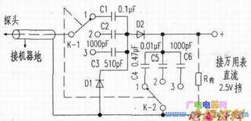 在检测比较复杂的彩电故障时,常常需要检测行、场逆程脉冲信号、沙堡脉冲信号、色度信号、字符信号或行、场同步信号等。若初学者没有示波器,可以用下图所示的多用检波头再配合直流2.5V挡即可检测上述信号。图l中Dl、D2接成倍压检波,被测的上述交流(脉冲)信号通过带同轴电缆的探头输入。检波头输出端理论上可获得约两倍被测信号峰值,但实际上的读数一般为被测信号峰值的10%~50%(跟信号传输、万用表内阻等因素有关)。图l中元件Dl、D2采用锗检波管(如2AP7、2AP9)或锗开关管(如2AK10、2AK11),这是因为锗管管压降只有0.2V,对小信号检测有利。C1~C3为高频瓷介或云母电容。C4~C6为薄膜或聚丙烯电容(它们耐压为160V~400V即可),这是因为它们的高频特性好且损耗小。K为双刀三掷拨动(或旋转)式开关。