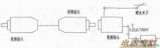 实现的办法就是做一个如下图所示的附件。取一段能插到电视机视频插口两端带有同样视频插头的导线一根,另外再拿一个视频插口,其接地的一端上一根带有鳄鱼夹子的导线,另一端(通信号的那一端)焊接上一只0.2211/1000V的器C,此器的另一端焊上带有测试棒的导线。