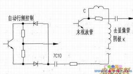 准备好了这些附件后就可进行探测了,举一两个实例来说明:如一台电视机出现有光栅无图像的故障,出现这种故障的范围较广,视放级及预视放级以前的都可能造成这种故障.通常的做法是手持起子用金属部分去碰触各级的输入端和输出端,看屏幕上的光栅是否有闪动而确定其故障点。但这种方法有时也不十分可靠,因为有故障的测试点,当起子去碰触时,光栅可能也会闪动,因此就造成误判断。现改成用”仪器”去探测时,可非常直观准确地看到测试点有无视频信号,从而迅速找出故障的所在。下面是笔者最近用此方法检测故障的过程,如下图所示。把准备好的视频插头一端插进探测用的电视机后面板视频输入端的插口(WDEO)内,另一端插到附件的视频插口内,再把该插口有夹子的导线夹到待测电视机的地端,而另一根带有测试棒的导线去碰触电路板上各测试点,测试通常可从后级往前级进行,故测试棒先点触末级视放管的集电极C,结果该测试点无信号;再测定该管的基极b,发现有图像。就说明该点以前的所有电路如末视放管基极电路,预视放管的输入输出电路,检波级及中放级高频头等都是正常的,故障就出在视放管集电极的通路上,这样一下子就把故障压缩到很小的范围。现在只需检查集电极回路上的各个元器件就行了,经查是集电极电路上的自动行频控制级的电容器C(7C10)短路,如右图所示。