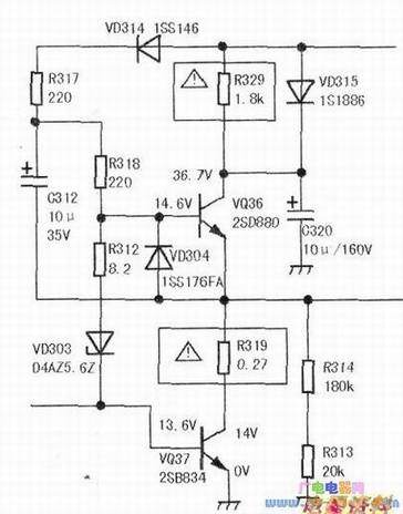 在收看过程中,又出现了新问题:图像上方出现多条回扫线且上部有局部压缩,说明场扫描电路也存在故障。根据维修经验,大多是电容老化或漏电所致。经仔细检查,发现场输出电路的电容C320(10μF/160V,见下图)位于两只场输出管的散热片之间,长期高温烘烤变质失效。将C320拆下,用数字表电容挡测其容量已不足0.2μF。将其换新,回扫线消失,图像基本恢复正常。为防止此电容再次损坏,用长导线将其引至远离散热片的位置固定。