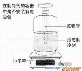 在充注冷媒前应先确定充注的制冷剂(冷媒)的类型,R410A的冷媒罐颜色是粉红色,而R22的冷媒罐颜色是绿色。另外,还应观察在装制冷剂的容器中是否安装有虹吸管,因为若使用有虹吸管的制冷剂容器,则充注制冷剂时就不能把容器倒置,如下图所示。