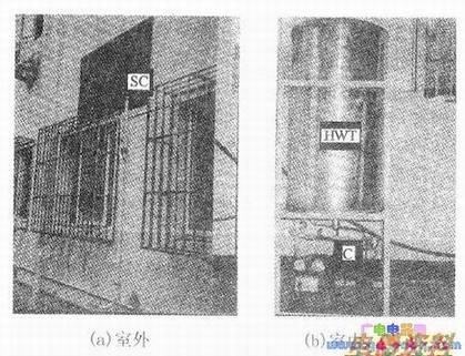 考虑到直膨式太阳能辅助热泵热水器在城乡各类建筑中的适用性,尤其是方便高层及多层建筑中非顶层住户的安装和使用,系统构建拟采用分体式结构,即将太阳能集热/蒸发器作为室外部分倾斜安装在屋顶之上或垂直挂装在外墙或阳台外壁上,将压缩机、贮热水箱等其余部件则装配为一个整体作为室内机放置在房间内或阳台上,室内、外机之间采用紫铜管加以连接。分体式太阳能热泵热水器的实际安装情况如下图所示。