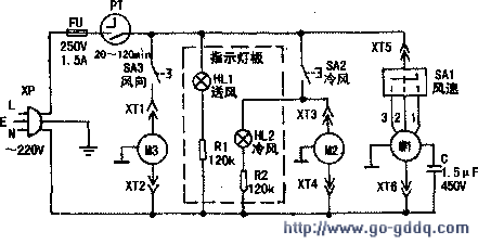信域牌EF-75B型空调扇如图所示。电路中,XP为带接地三极插头。FU为保险,PT为定时器,SA1为风速开关,SA2为冷风开关,SA3为风向开关。M1为风扇电机。M2冷风电机,M3风向电机,HL1为送风指示灯,HL2为冷风指示灯。