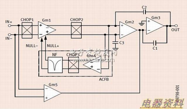 零漂移放大器设计技术已经取得了多项突破。最近,ADI公司为一种新型斩波技术申请了专利,它利用一个称为自动校正反馈(ACFB)的本地反馈环路来消除失调电压。该反馈环路有助于实现更低的失调电压和漂移,从而防止在整个输出中出现电压纹波。其简化框图如图1所示。它由一条带自动校正反馈(ACFB)功能的高直流增益路径和一条高频前馈路径并联而成。输入基带信号最初由输入斩波开关网络CHOP1调制。然后,输出斩波开关网络CHOP2解调输入信号,并将跨导放大器Gm1的初始失调和1/f噪声调制到斩波频率。在ACFB环路中,初始失调和1/f噪声由斩波网络CHOP3解调到直流域,经过陷波后馈入Gm1的调零输入端。Gm1进而消除初始失调和1/f噪声。这样,ACFB环路有选择性地抑制不需要的失调电压和1/f噪声,同时又不会干扰所需的输入基带信号。高频前馈路径的作用是放大接近或高于斩波频率的任何高频输入信号,它还能旁路ACFB环路造成的相移。