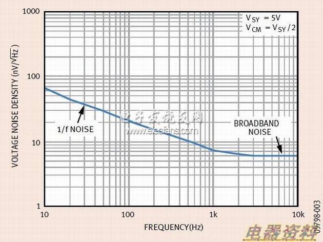 图3:零漂移放大器:电压噪声密度与频率的关系