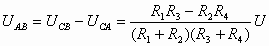 当电桥输出端接有放大器时,由于放大器的很高,所以可以认为电桥的负载电阻为无穷大,这时电桥以电压的形式输出。输出电压即为电桥输出端的开路电压,其表达式为
