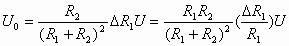 对于输出对称电桥,此时R1=R2=R,R3=R4=R?/SUP>,当R1臂的电阻产生变化ΔR1=ΔR,根据(1-4-7)可得到输出电压为