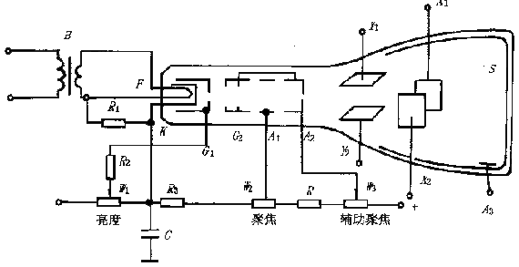 电子枪由灯丝(F)、阴极(K)、栅极(G1)、前加速极(G2)(或称第二栅极)、第一阳极(A1)和第二阳极(A2)组成。它的作用是发射电子并形成很细的高速电子束。灯丝通电加热阴极,阴极受热发射电子。栅极是一个顶部有小孔的金属园筒,套在阴极外面。由于栅极电位比阴极低,对阴极发射的电子起控制作用,一般只有运动初速度大的少量电子,在阳极的作用下能穿过栅极小孔,奔向荧光屏。初速度小的电子仍返回阴极。如果栅极电位过低,则全部电子返回阴极,即管子截止。调节电路中的W1电位器,可以改变栅极电位,控制射向荧光屏的电子流密度,从而达到调节亮点的辉度。第一阳极、第二阳极和前加速极都是与阴极在同一条轴线上的三个金属圆筒。前加速极G2与A2相连,所加电位比A1高。G2的正电位对阴极电子奔向荧光屏起加速作用。