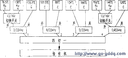 首先在4切1的各个输入端口分别连接一个22k开关。然后在4切l连接的1端口22kHz开关开的端口上再连接一只13/16V开关,4切1的4端口22kHz开关开的端口也按照此方法连接一只13/16V切换开关,其他连接方法如图所示。注意:76.5°E Ku头只收垂直极化,138°E Ku头旋转90°后再把接收机原设置垂直极化改为水平极化,Ku头的本振都设置为11300。