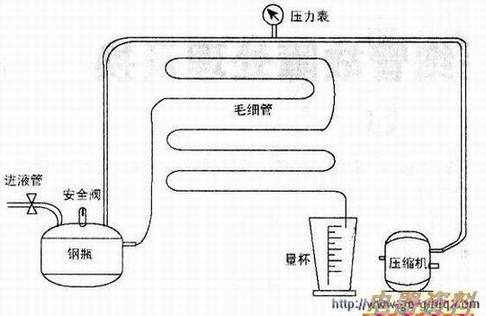 毛细管在流拭一定时(即压缩机排气动力一定),它的孔径和长度成正比关系,也就是说,毛细管孔径越小,其长度越短;反之,毛细管孔径越大,其长度越长。利用毛细管孔径和长度之比的阻流作用控制冰箱制冷剂流量,保持进入蒸发器内制冷剂的合理蒸发压力,是实现最大制冷能力的保障,这在冰箱出厂时已完全配比好了,无需改动。当冰箱需要更换蒸发器、毛细管、蕊管等操作时,必须对新毛细管进行流量测定,具体力法如下:(1)配置好压力钢瓶,如上图所示,往钢瓶内注入液体(四氯化碳、酒精,也可以足清水),其液体注入量应是冰箱铭牌标定的制冷剂注入量的2--3倍,注入后将阀1关闭,启动气泵(就是所修冰箱的压缩机),通过可控压力表将钢瓶内的气压控制在1.175MPa~1.2MPa范围内,在单位时,问内流人量杯内的液体等于冰箱铭牌规定的制冷剂注入量,就是该毛细管的标准流量。当然也叫将电子秤置于量杯下,用重量的等量法来判定毛细管流量。(2)选购新毛细管的长度一定要稍大于实际需要的长度。