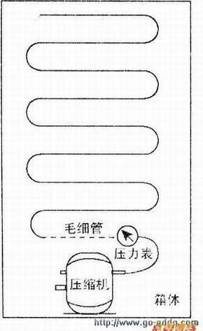 将新购好的毛细管与压缩机、修理表正确接通后,如下图所示,启动冰箱压缩机,当修理表压力上升至1.175MPa~1.2MPa时,压力肯定还会继续上升(因毛细管选购时的长度超出了实际需要长度),此时应将毛细管末端逐渐截短(为了求稳,每次以100mm递减为宜),商至表压力始终稳定在1.175Mpa~1.2Mlk范围内,此时毛细管的长度就是该冰箱制冷剂所衙流量的标准长度。