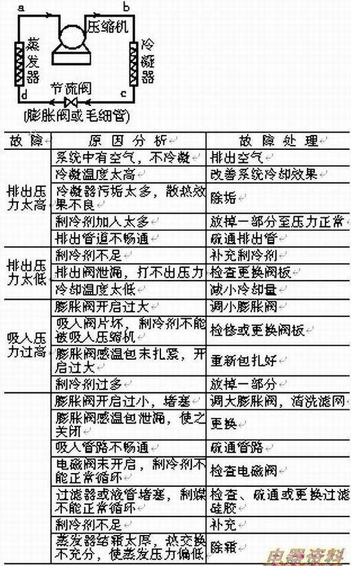 目前,常用的有13号、18号、25号和30号4种规格。 3.常见故障分析与处理 制冷系统所有故障最终都表现为不制冷或效果差。