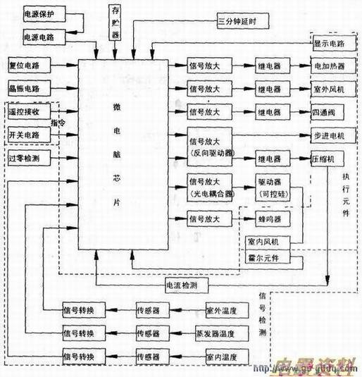 与电视机的修理一样,要想准确地判断故障和修理故障,还是少不了学会看懂图、分析电路图。为了方便理解,我们将电路原理图简化成了框图(附图):各把检测到的各种非电信号(温度、、、转速等)经过信号转换、放大后输入到微电脑芯片,与人为指令(遥控、开关等)进行比较、判断和运算后发出控制信号去驱动各执行元件工作,完成空调器的各项功能(显示、报警、制冷、制热、除湿等)。因此只要了解各单元电路的功能与特征,修理空调电路板就轻松多了。