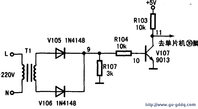 控制原理:附图是过零检测控制原理图。该电路与直流电路共用T1,通过变压器降压,再由两个整流,然后通过的分压和限流,得到lOO的脉动信号,经过三极管V107的作用,在11点得到100Hz的脉冲矩形波,去的(39)脚。此信号经过单片机内部控制后,再去控制室内风机驱动电路,使室内风机以不同的速度运转。