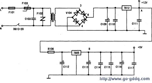 如图所示,该由保险管F10l、抗干扰C10l~103、防过F102、超温保护热敏F103等组成前端保护及抗干扰电路;由Tl将220V电压降至15V,经过V10l~104四个整流,C109、c110,由三端稳压集成块7812稳压输出12V直流;电容C11l、C112滤波,由三端稳压集成块7805稳压输出5V直流电源。12V、5V两种直流电分别供应给电路板相应的分立电路和芯片使用。