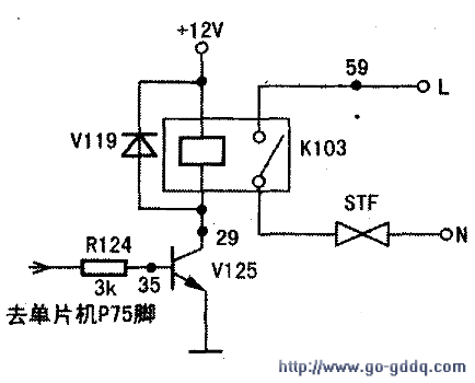 该常见故障是三极管或损坏。在断电情况下测量触点两端的,若阻值为零,则说明触点粘连。通电情况下,若测得29点与12V供电端两点为11V以上,且触点两端的电压为220V,则为继电器触点烧断。