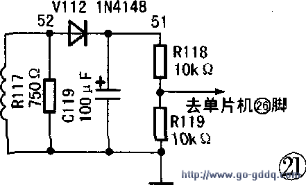 机的运行电流感生为交流,经过V112整流、C119之后,再由R118、R119分压,送入P63(26脚),单片机根据内部程序计算,判断压缩机运行负荷 (电流)是否超载,以便对空调器进行保护。